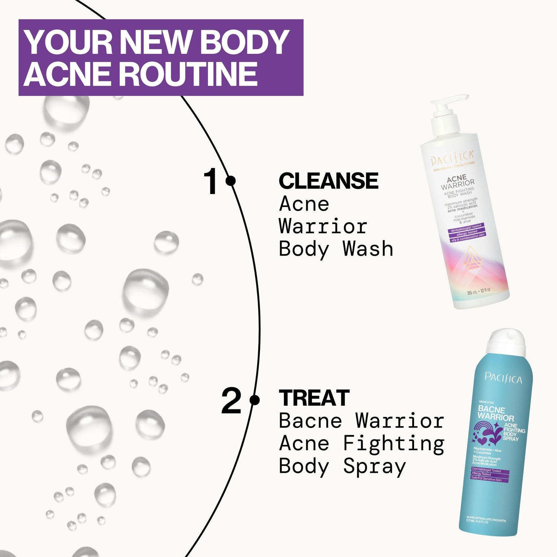 Don't let bacne keep you from showing your beautiful body! We’ve got your back! From our fan favorite Acne Warrior line, we added this convenient continuous acne-fighting body spray to easily treat body acne even in hard-to-reach places – on your back, chest and other areas that need support. This medicated, and sensitive skin-approved spray combines maximum strength 2% salicylic acid infused with natural extracts in a lightweight medicated spray to target body acne, wherever it may appear.