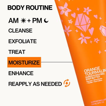 - Moisturize & Glow – Apply Orange Tourmaline Super Hydrating Body Butter onto dry skin, massaging in until fully absorbed. Use morning and evening or whenever skin needs extra hydration.